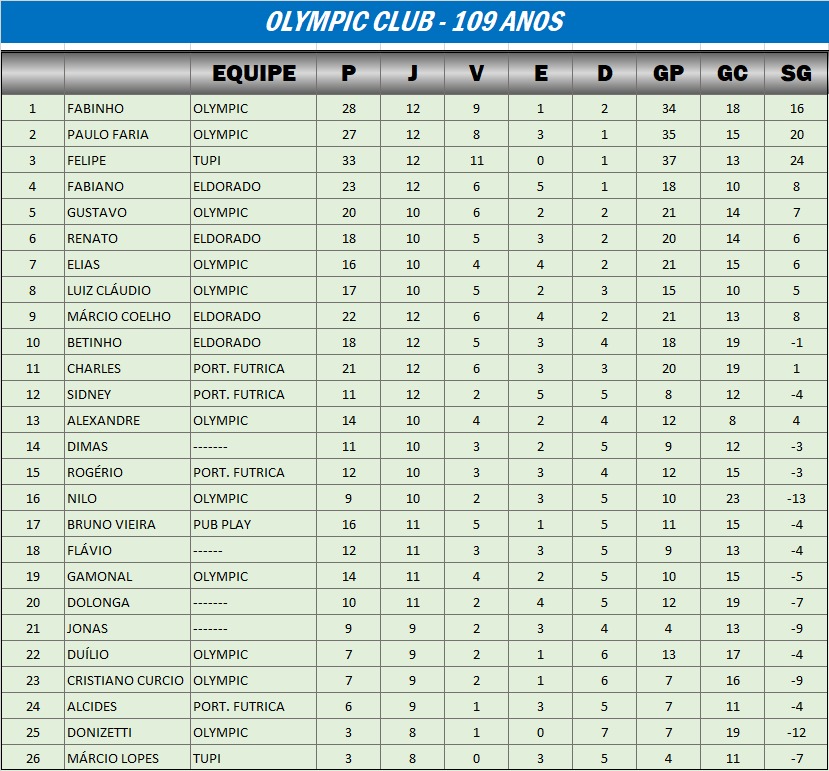 O título do torneio que celebrou os 109 anos de fundação do Olympic, em Barbacena, ficou com o botonista Fabinho (Olympic), que somou nove vitórias, duas derrotas e um empate em 12 jogos. Paulo Faria (Olympic) foi o segundo, seguido por Felipe (Tupi). A competição, disputada no domingo, 28, na regra Dadinho, contou com a participação de 26 técnicos. Confira a classificação das taças Ouro, Prata e Bronze a seguir: